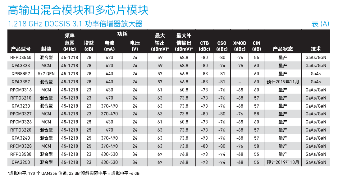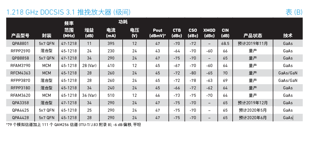 Qorvo?提供創(chuàng)新的半導(dǎo)體解決方案,是領(lǐng)先的連接和電源解決方案提供商。作為射頻和電源領(lǐng)域的全球領(lǐng)導(dǎo)者,Qorvo將產(chǎn)品和技術(shù)領(lǐng)先地位、系統(tǒng)級專業(yè)知識以及全球制造規(guī)模相結(jié)合,以快速解決客戶最復(fù)雜的技術(shù)挑戰(zhàn)。Qorvo服務(wù)于全球大型市場的各種高增長細分市場,包括消費類電子產(chǎn)品、智能家居/IoT、汽車、電動汽車、電池供電電器、網(wǎng)絡(luò)基礎(chǔ)設(shè)施、醫(yī)療保健和航空航天/國防。解決方案保持寬帶連接領(lǐng)域的技術(shù)領(lǐng)先地位Qorvo?為高要求的混合式光纖同軸?(HFC)?和寬帶應(yīng)用提供領(lǐng)先技術(shù)和全面的產(chǎn)品解決方案.?Qorvo?的寬帶產(chǎn)品組合包括采用業(yè)界標(biāo)準(zhǔn)?SOT115J?封裝和多芯片模塊?(MCMs)?的高功率放大器,?低功率?MMICs?和控制產(chǎn)品.?這些產(chǎn)品專為?HFC?頭端,?CMTS,?光纖節(jié)點以及支持?DOCSIS?標(biāo)準(zhǔn)的分布式架構(gòu)而設(shè)計,?可采用各種不同的配置,?如深度光?纖,?節(jié)點分裂,?遠程?PHY,?全雙工以及擴展頻譜?DOCSIS.?此外,?Qorvo?還提供適用于?FTTx?和?xPON?系統(tǒng)解決方案的產(chǎn)品,?以及互阻抗放大器和完整的光學(xué)模塊.